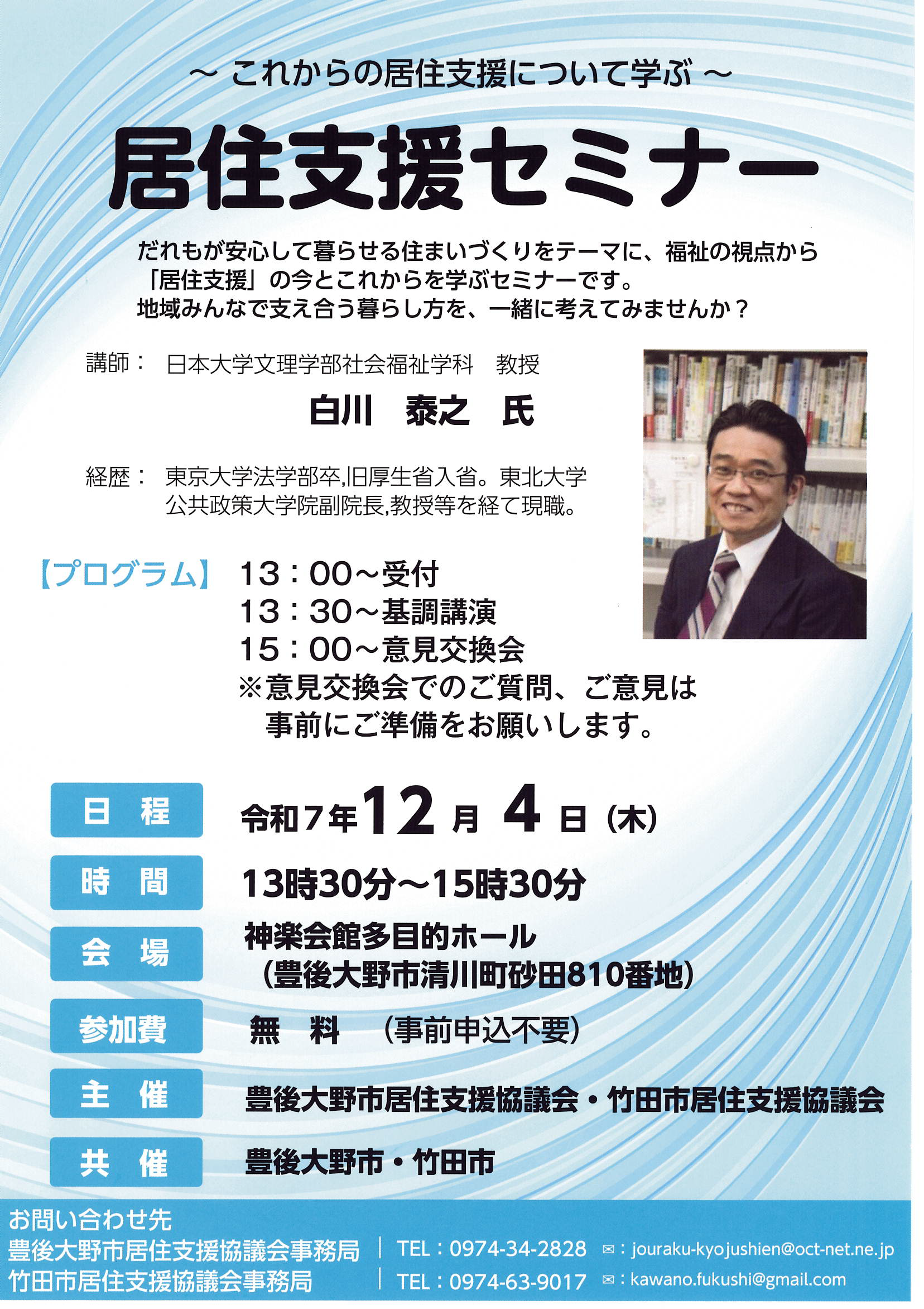 12月4日、竹田市居住支援協議会と豊後大野居住支援協議会の合同による居住支援セミナーを、豊後大野市清川町・神楽会館多目的ホールで開催しました。